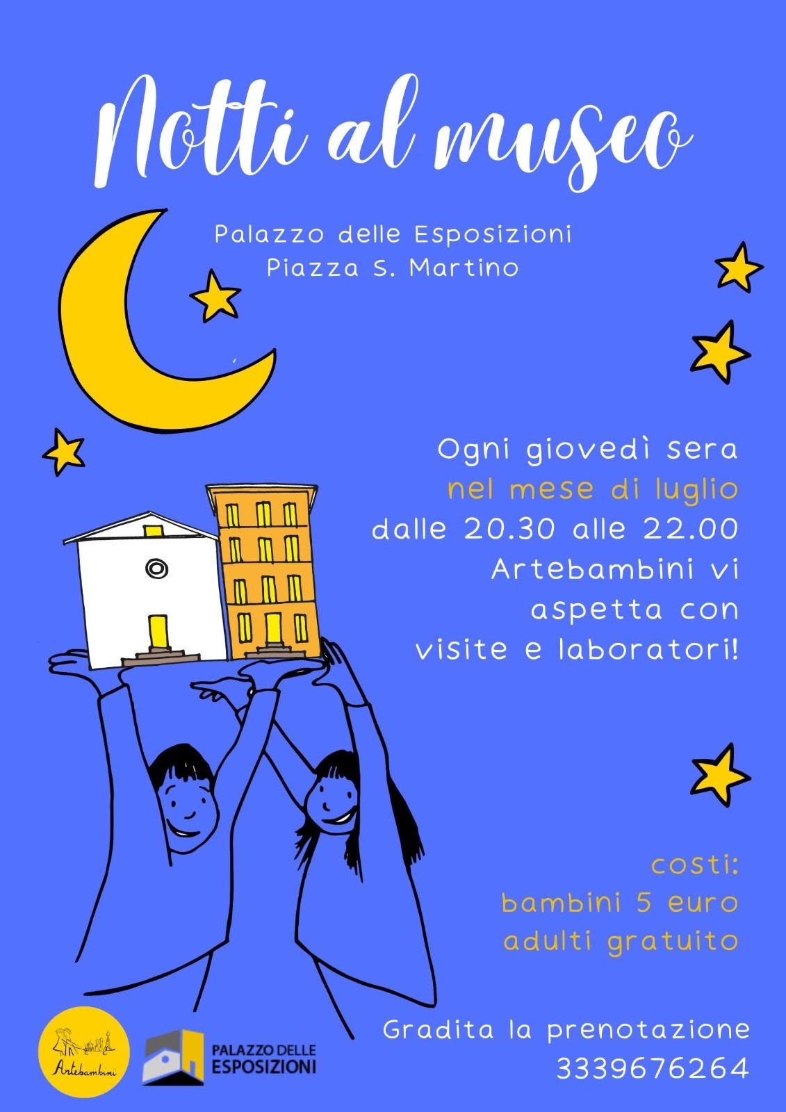 NOTTI AL MUSEO Visite e laboratori Palazzo delle Esposizioni a Lucca Piazza San Martino 🎨ARTEBAMBINI vi aspetta tutti i GIOVEDI di LUGLIO, dalle 20:30 alle 22 noi siamo lì con libri, storie, visite guidate e laboratori. ✅Gradita la prenotazione. 👉Costo speciale di 5 euro. ☎️Per info e prenotazioni: 333 967 6264 |