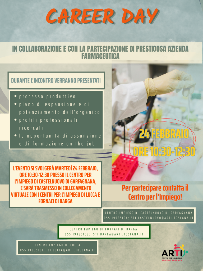 I Centri per l’Impiego di Castelnuovo di Garfagnana, Fornaci di Barga e Lucca, in collaborazione con un’azienda leader nel settore farmaceutico, hanno organizzato un Career Day finalizzato a promuovere e far conoscere le opportunità occupazionali offerte dal settore nel territorio.