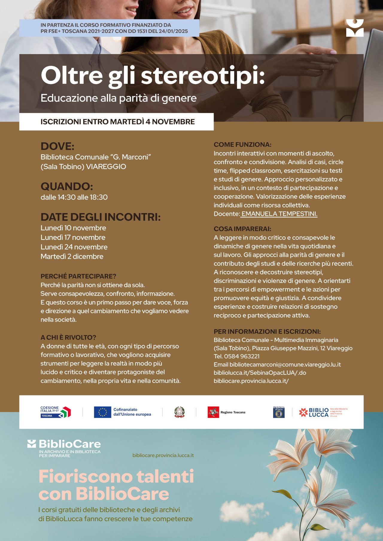PER INFORMAZIONI E ISCRIZIONI: Biblioteca Comunale – Multimediale Immaginaria (Sala Tobino), Piazza Giuseppe Mazzini, 12 Viareggio Tel. 0584 963221 Email bibliotecamarconi@comune.viareggio.lu.it bibliolucca@bibliosbapp.LU.it/ bibliocare.provincia.lucca.it/